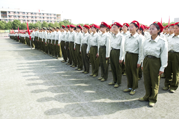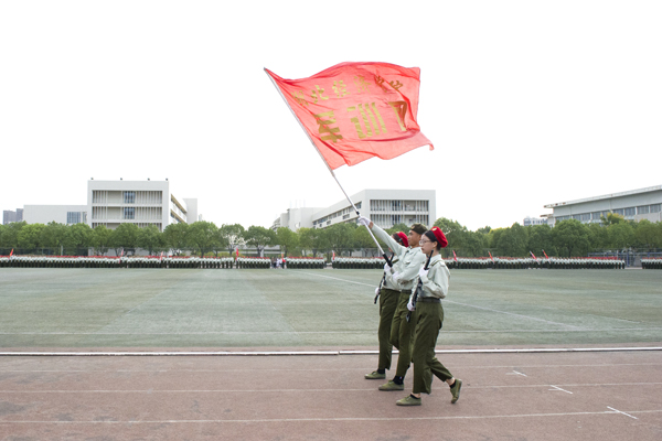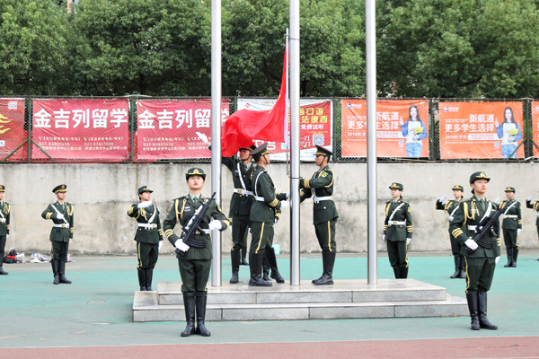 升旗仪式,全体师生面向国旗行注目礼,全体教官行军礼。伴随着国歌声,五星红旗冉冉升起。阅兵指挥员一声令下“迎军旗”,全体师生、教官起立,向军旗敬礼。