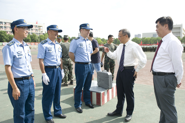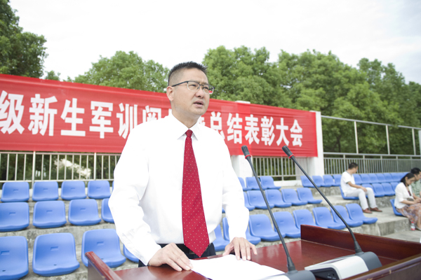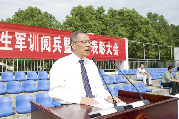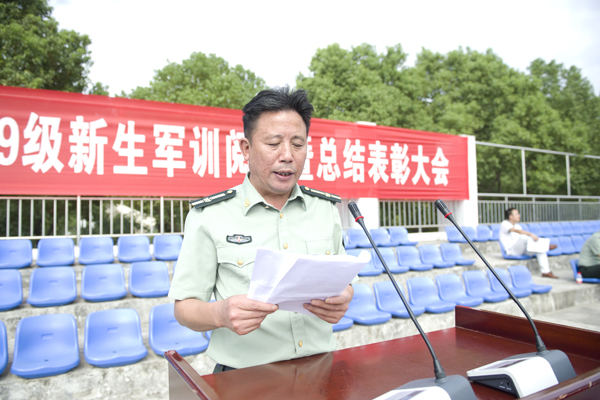 校党委书记温兴生讲话。他表示,全体教官充分发扬人民子弟兵的光荣传统和优良作风,按照训练计划,精心组织、严格要求、以身作则,展示了饱满的政治热情、严谨的工作作风和良好的军人形象。他对全体新生的军训成果表示肯定,并对军训教官表示感谢。