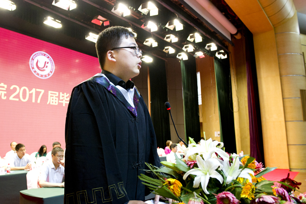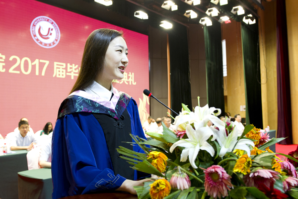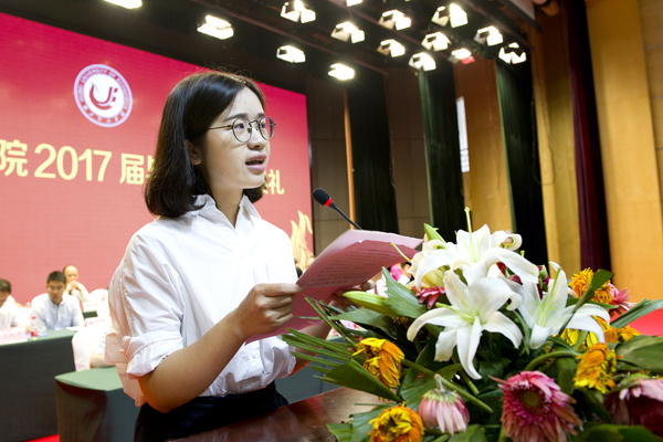 会计硕士专业研究生韩馨璐、信息管理与统计学院信合Q1342班郭荣铭作为毕业生代表发言;新闻与传播学院李靓博士作为教师代表发言。