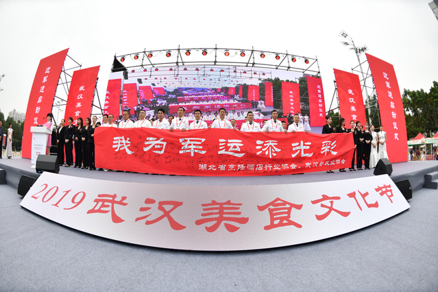 本网讯 10月10日, 武汉美食文化节迎军运活动启动仪式在武昌首义广场举行。仪式上,我校旅游与酒店管理学院副教授邹志平代表第七届世界军人运动会餐饮专家顾问和大会组委会公布了“迎军运•到武汉必吃的名菜和名小吃”菜单。
