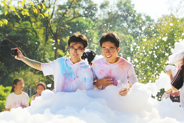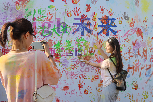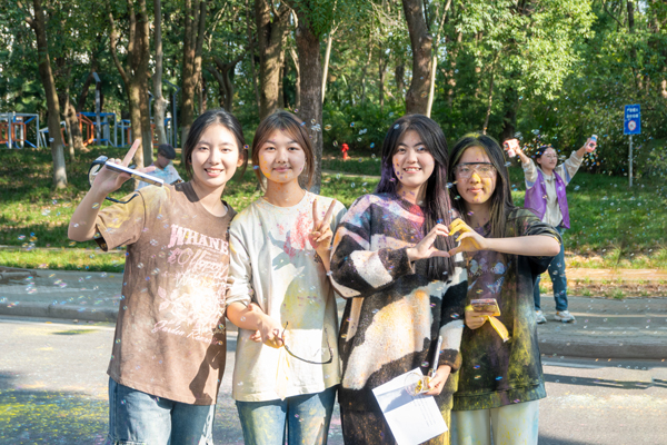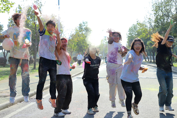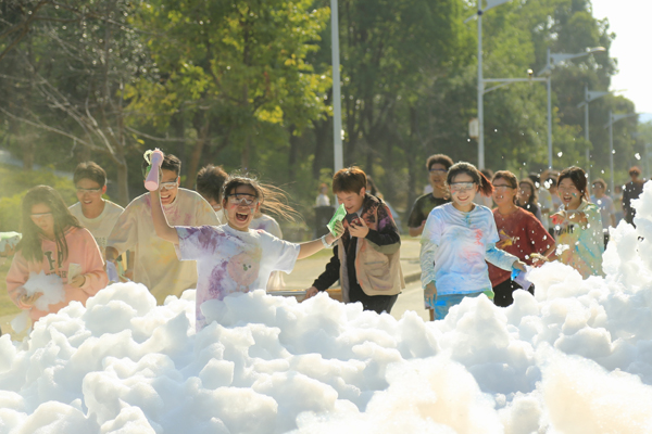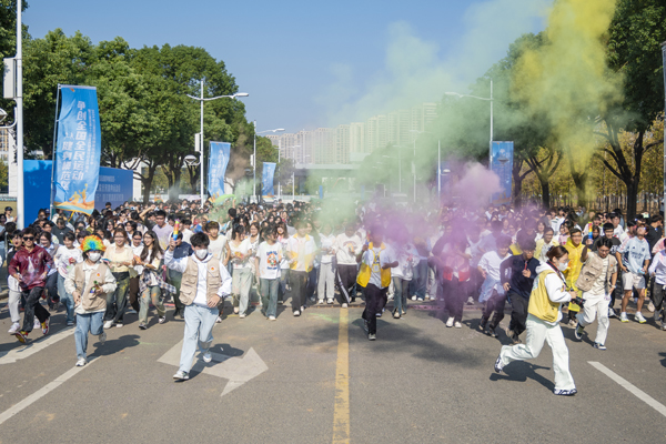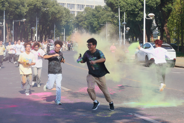 活动开始前,主持人带领大家进行热身活动。随着开跑指令发出,同学们欢呼并向空中撒玉米粉,与手持彩烟的领跑同学一齐跑出起跑线。五颜六色的玉米粉为同学们的白色衣服染上了花色。同学们的欢声笑语在校园中传播,激情热血在跑步中点燃。到达终点后,同学们纷纷激动地在签名墙上留下自己的手掌印,并拍照留念。