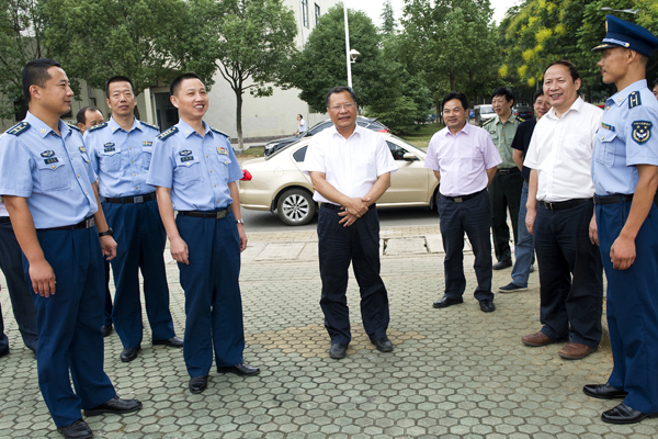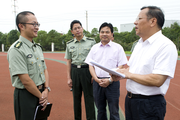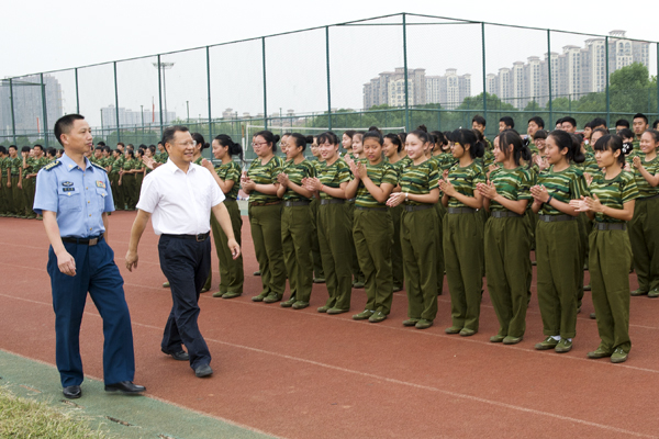 本网讯(记者 陶慧 摄影报道)9月11日,2015级新生军训第6天,校党委书记温兴生率校领导廖长林、陈向军、张以林,党委办公室、院长办公室、学工处、武装部、团委等部门负责人,到军训现场看望慰问空军预警学院军训教官和受训新生。空军预警学院陆基预警系政委邓朗顺大校陪同。