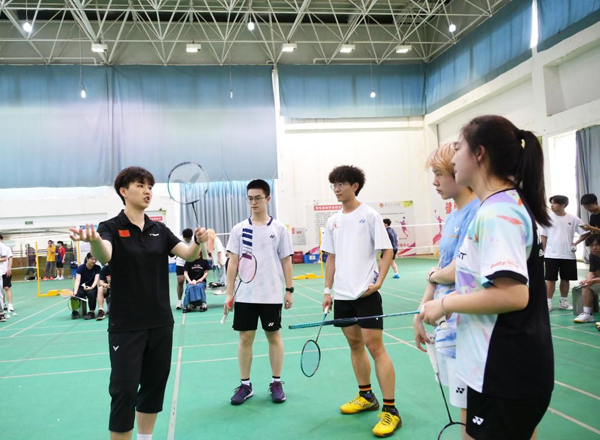 讲座结束后,李茵晖在体育馆对学生们进行羽毛球技术指导教学,并与师生就羽毛球教学、竞赛等问题进行深入交流。