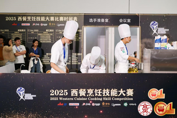 “2025中餐厨艺世界锦标赛”赛项团队由王波(楚菜现代产业学院产业教授),企业教师房丞杰、韩号,烹饪与营养教育专业毕业生彭冲组成,参赛团队需在180分钟内现场完成5套位上作品(每套含1道凉菜、1道例汤、1道肉食热菜、1道水产热菜、1道面点/甜品)。“2025西餐烹饪技能大赛”赛项团队由周子峻(楚菜现代产业学院)、烹饪与营养教育专业2421班阮国典、程月琪组成,参赛团队需在180分钟内完成7道菜(3份现代自由式沙拉、3份小食、3份冷开胃菜、3份汤、3份海鲜热菜/主菜、3份肉类热菜/主菜、3份甜点)。“楚菜非遗小吃展”团队由楚菜现代产业学院合作企业楚汉三镇民生甜食馆熊飞、老谦记豆丝沈祖学等10人参加,展示了武汉热干面、三镇民生豆皮、老谦记豆丝等10来种楚菜小吃,该展台连续两天是“排队人气王”之一,得到行业专家大师好评。