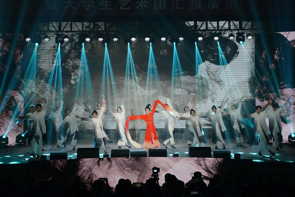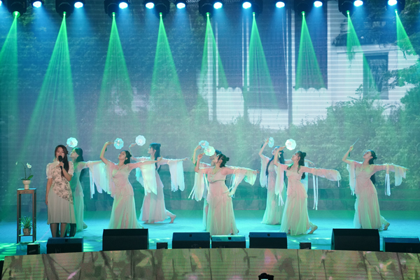 婉转悠扬的歌声响起,观众的思绪被大学生艺术团舞蹈队和声乐队表演的《如画江南》带入篇章一。舞者们身姿娉婷袅娜,罗扇轻舞,似有丝丝清风拂面。
