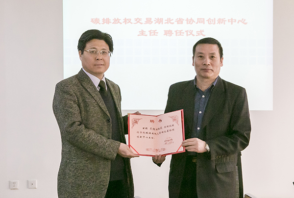 本网讯(通讯员 谷木荣 谭支雄)3月3日,学校举行碳排放权交易湖北省协同创新中心(培育)(以下简称“中心”) 齐绍洲主任聘任仪式。校长、中心理事长漆腊应与齐绍洲教授签订聘任合同并颁发聘书。校党委书记温兴生、党委副书记张奋勤出席,教务处、人事处、科研处、经济学系、金融学院、环境资源与国际贸易学院、财政与公共管理学院、中心等相关部门院系负责人及教师代表参加。聘任仪式由陈向军主持。