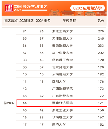 2025年10月15日,2025软科中国最好学科排名公布,我校应用经济学学科首次上榜,排名第44位,进入全国前20%。