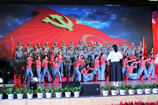 “没有共产党就没有新中国!”法商学院演唱的京剧版《没有共产党就没有新中国》演绎了从1921年到2021年的百年党史经典情景,党旗挥舞,歌声激昂,点燃了现场观众的热情,将全场气势推向高潮,赢得了雷鸣般的掌声。“五十六个星座,五十六支花,五十六族兄弟姐妹是一家!”图书馆五十六位教师身着各民族服饰登场,将准备了两个多月的合唱歌曲《爱我中华》完美展现。长征途中,大河雪山,险阻连连;敌军围堵,危机重重,英勇的红军在以毛主席为首的党中央领导下,四渡赤水破重围,巧渡金沙甩追兵,财政与公共管理学院的《长征组歌四渡赤水出奇兵》将长征中的苦难演绎得淋漓尽致。“若有战,召必回。”信息管理与统计学院召回五名退伍士兵参与合唱,军姿飒爽,口令铿锵,《强军战歌》气势昂扬!