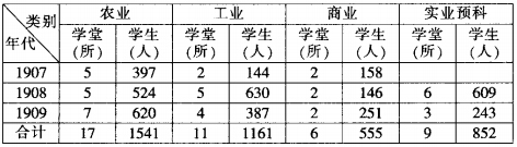 尽管有张之洞的大力倡导和推动,但是,湖北、武汉的商业教育难以赶上工业教育、农业教育的步伐。从1907~1909年湖北实业学堂统计资料中,即可看到其间明显差距,具体数据如下: